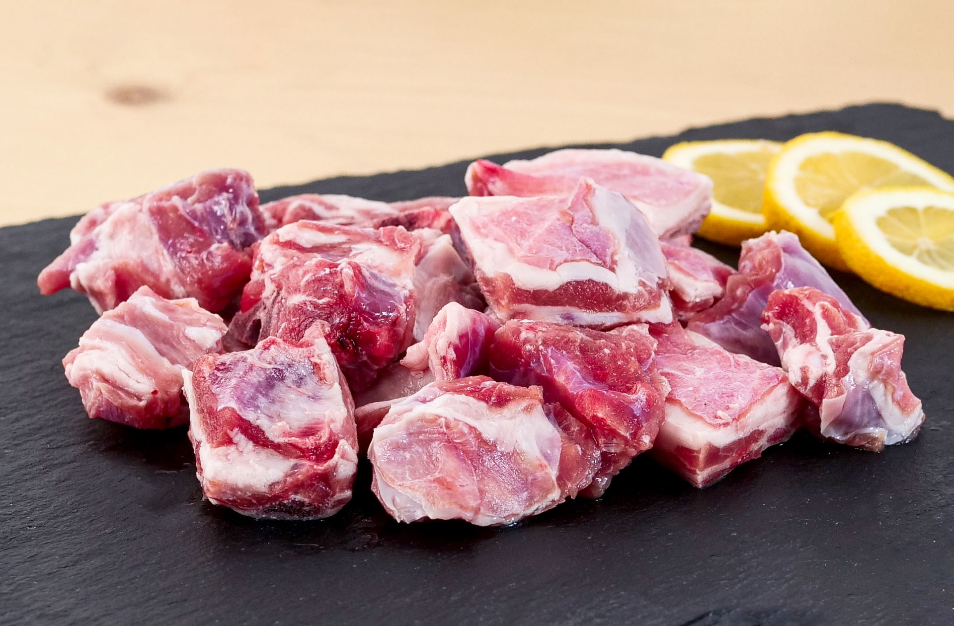 Carne da pá, cachaço e peito cortada aos cubos e embalada a vácuo, congelada.