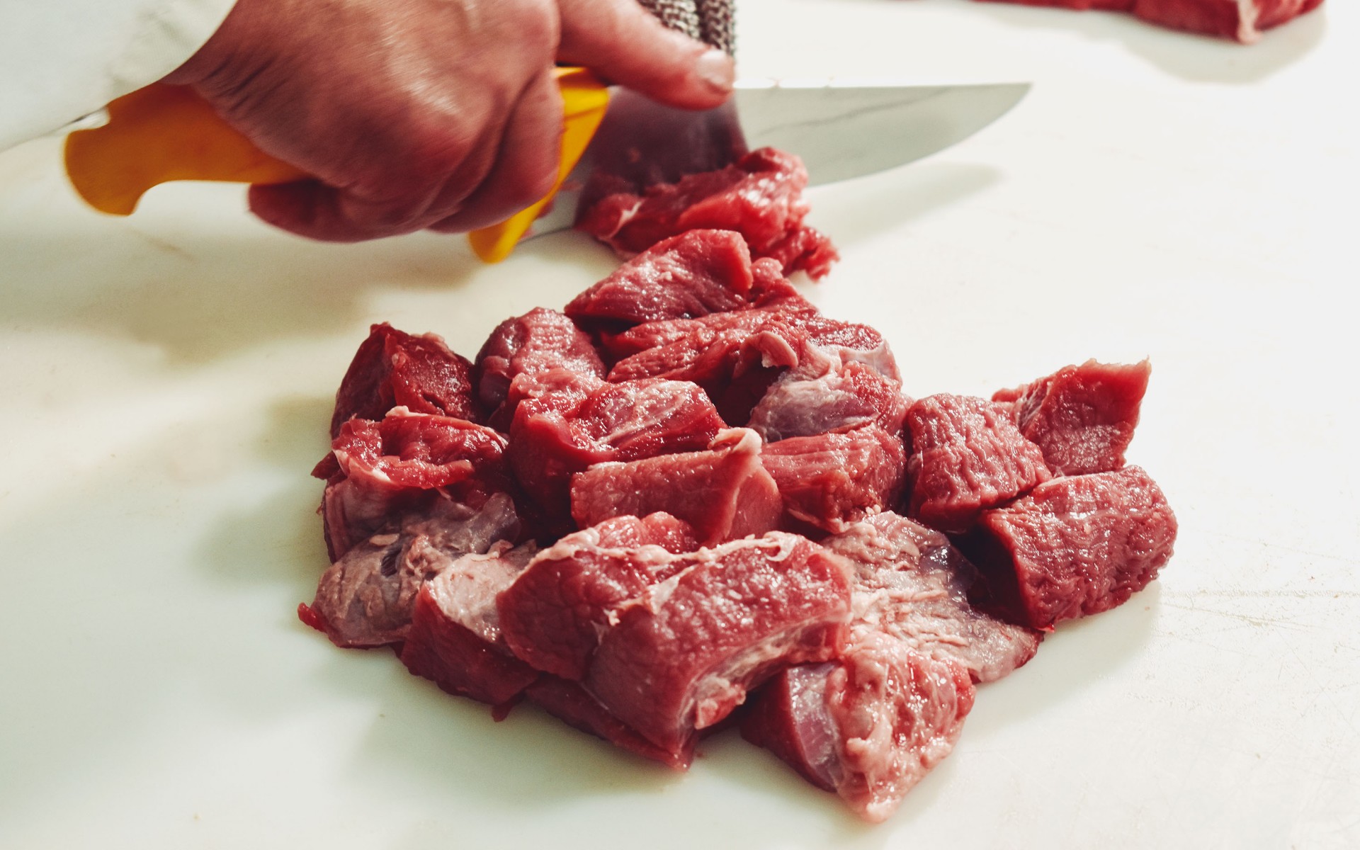 Carne de vitela/vitelão cortada aos cubos embalada em vácuo.